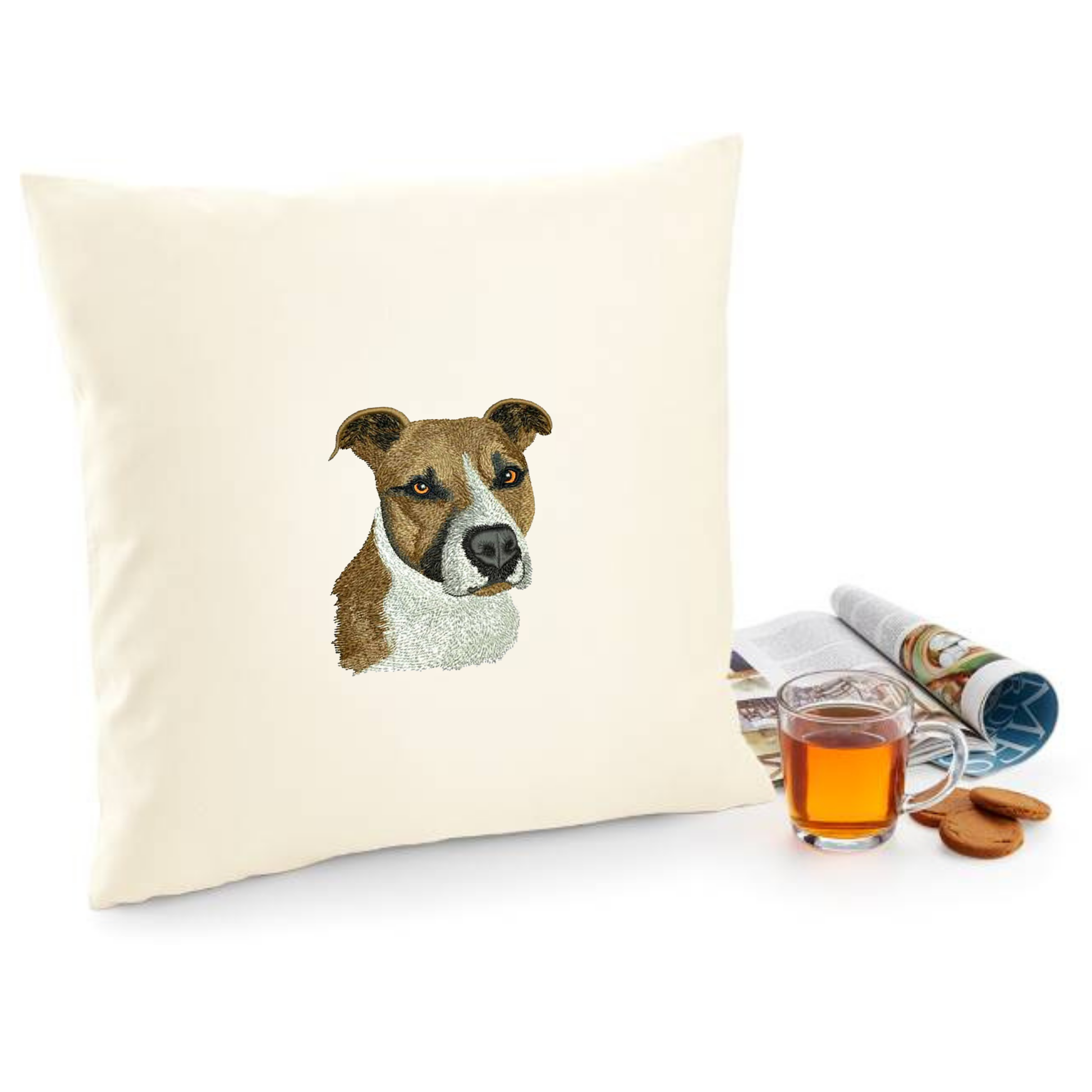 Añade calidez a tu hogar con esta funda de cojín decorativa, bellamente bordada con la imagen de un American Pit Bull Terrier lleno de amor.