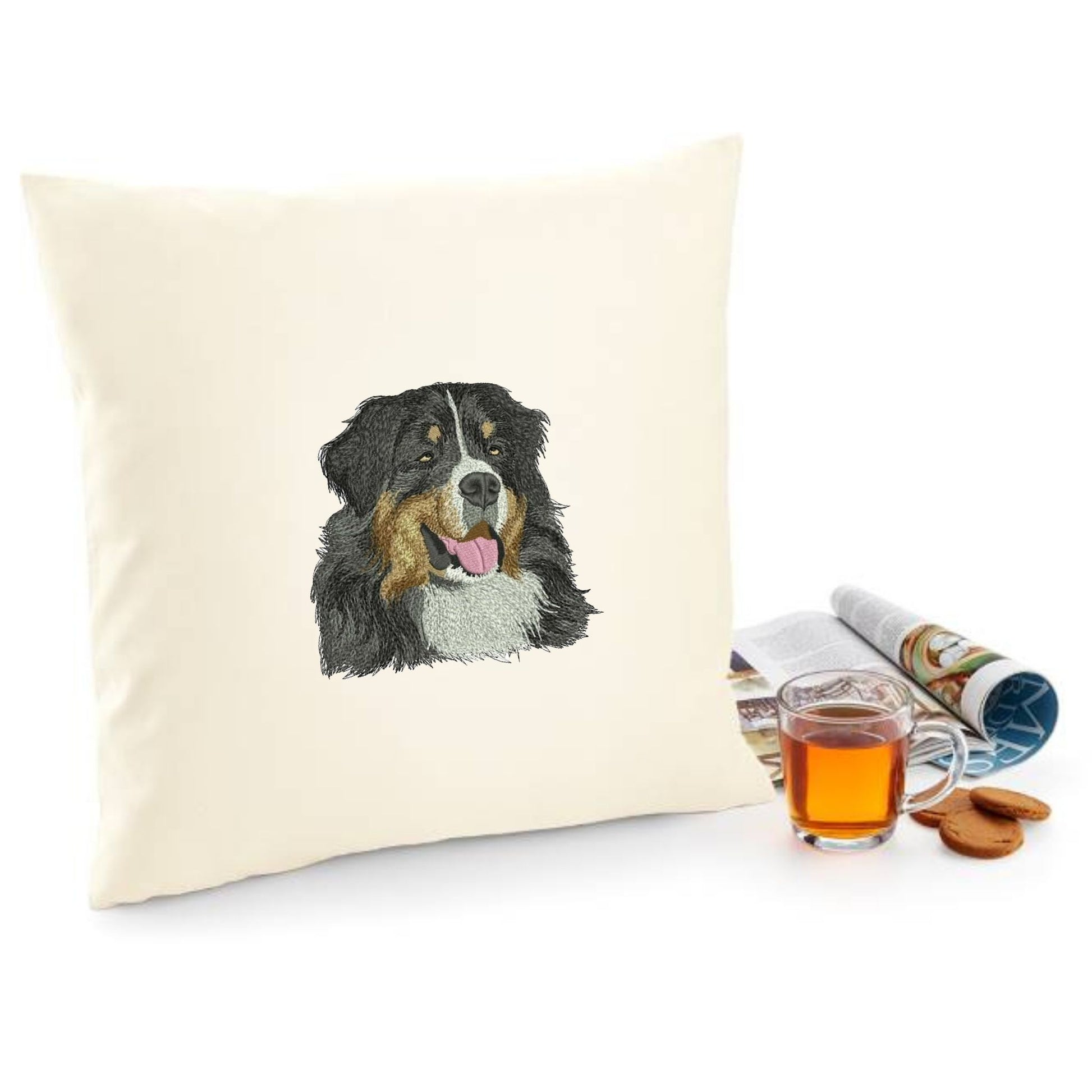 Añade calidez a tu hogar con esta funda de cojín decorativa, bellamente bordada con la imagen de un Bernese mountain dog.