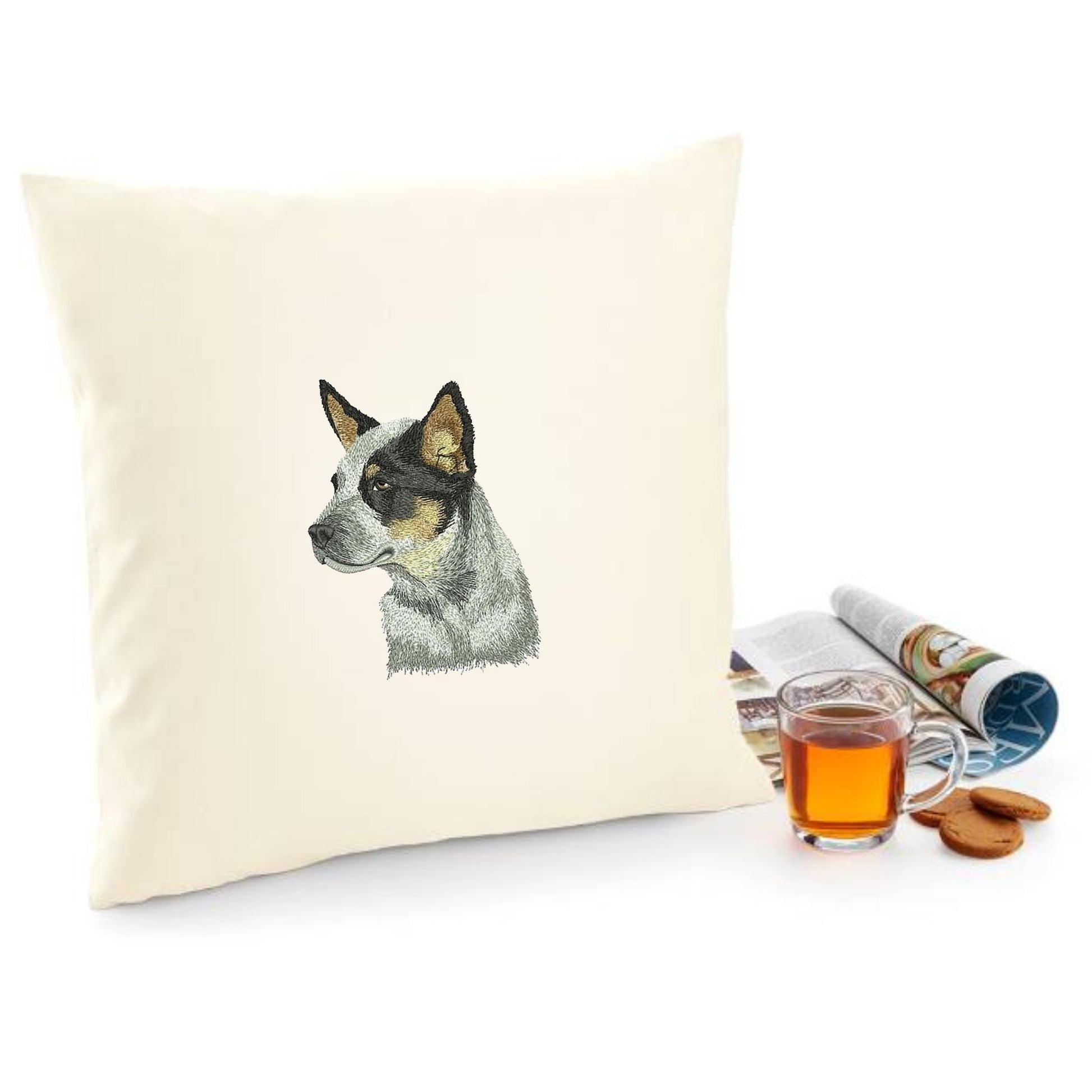 Añade calidez a tu hogar con esta funda de cojín decorativa, bellamente bordada con la imagen de un Australian cattle dog.