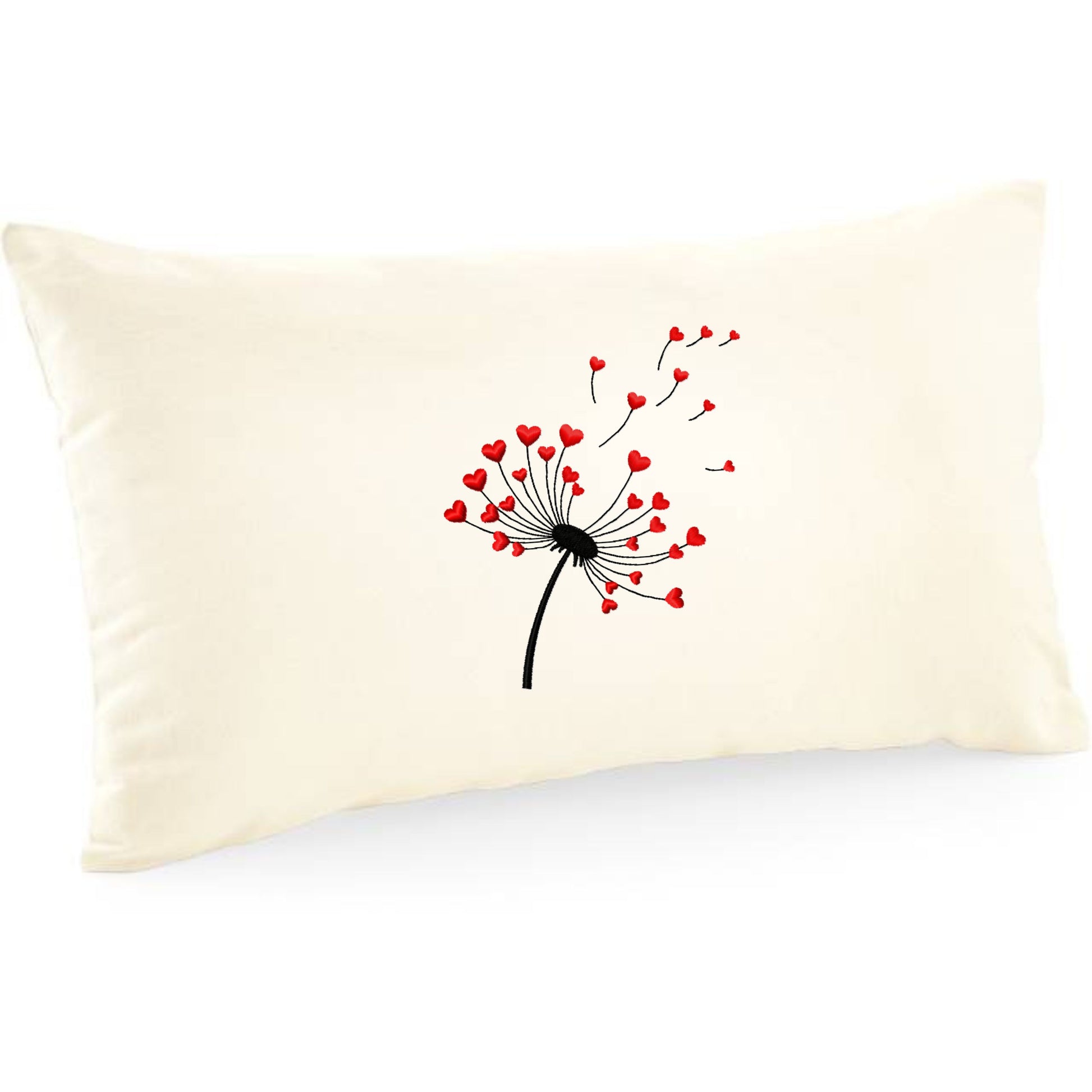 Añade calidez y estilo a tu hogar con esta funda de cojín, delicadamente bordada con un diente de león acompañado de pequeños corazones rojos.