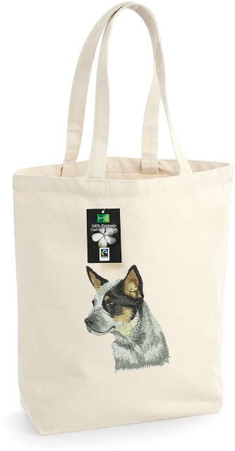 Lleva a tu amigo de cuatro patas favorito contigo a todas partes con esta encantadora bolsa de tela, adornada con un delicado bordado de un perro boyero australiano.
